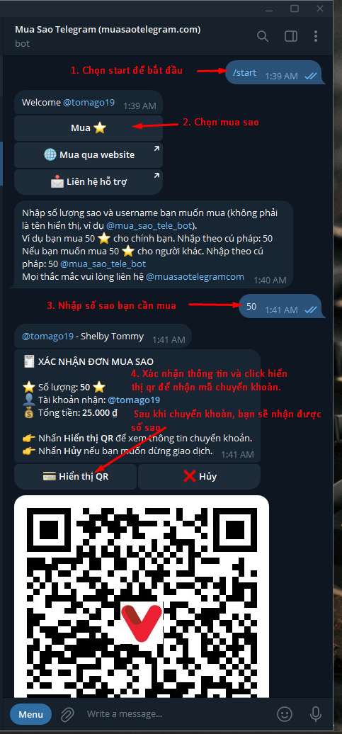 Mua qua bot @mua_sao_tele_bot trên telegram. Không cần tạo tài khoản website. Nhắn tin với cú pháp /buy_star và làm theo hướng dẫn.
